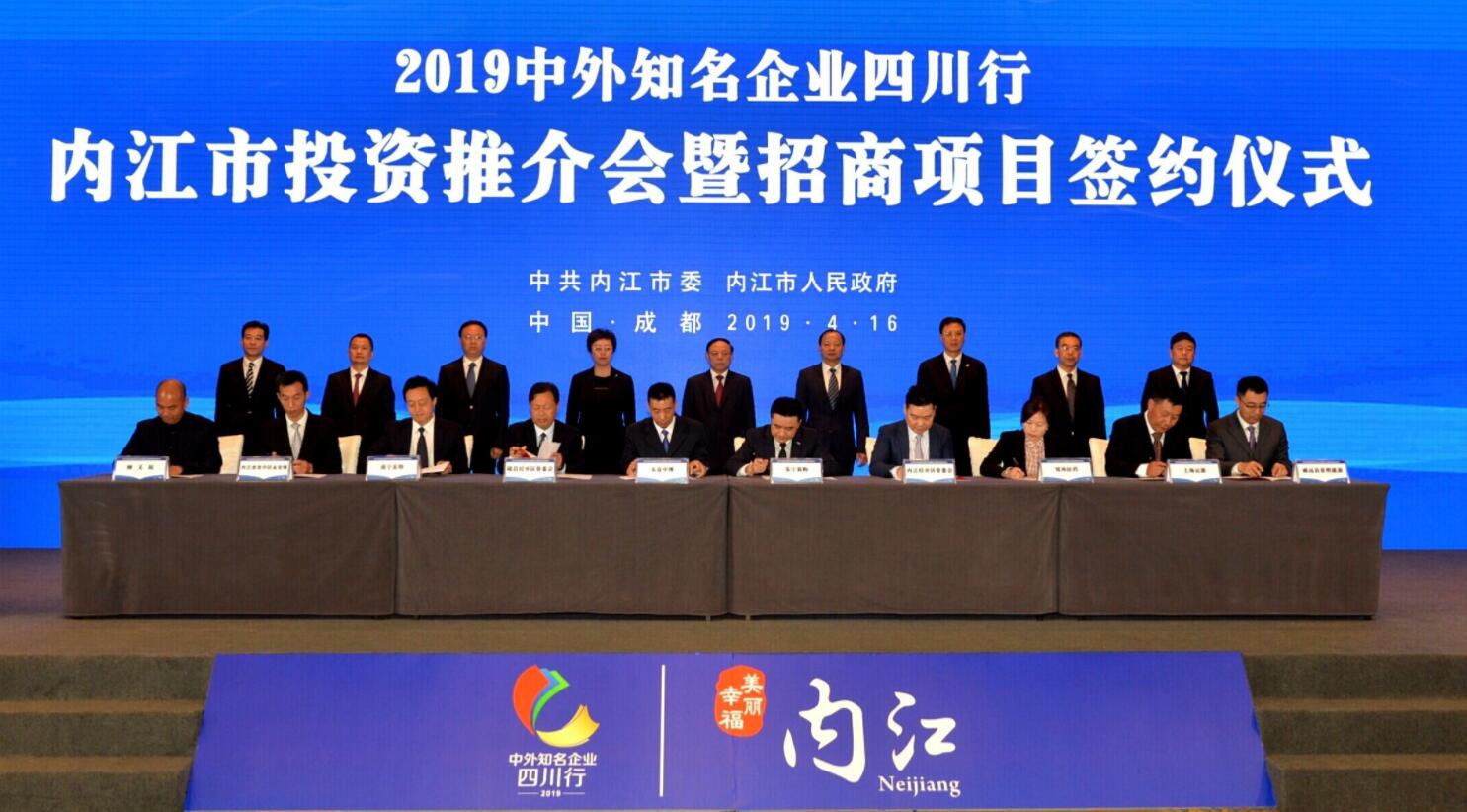 【香港商報網訊】2019中外知名企業四川行活動4月16日在成都啟幕。570家企業、363名董事長及總經理將參加這場年度盛會。當天下午,作為該系列活動的重要組成部分之一,在內江市投資推介會暨招商項目簽約儀式上,內江攜189個項目與150餘位中外知名企業家代表親密接觸。現場,內江還與各方簽約項目34個,投資總額332.2億元。