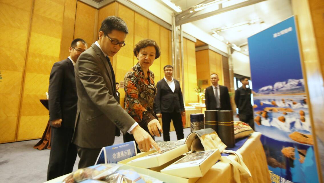 澳門旅遊局副局長程衞東(左)與新疆維吾爾自治區文化和旅遊廳副廳長古麗·阿不力木(右)參觀新疆文創產品展示區