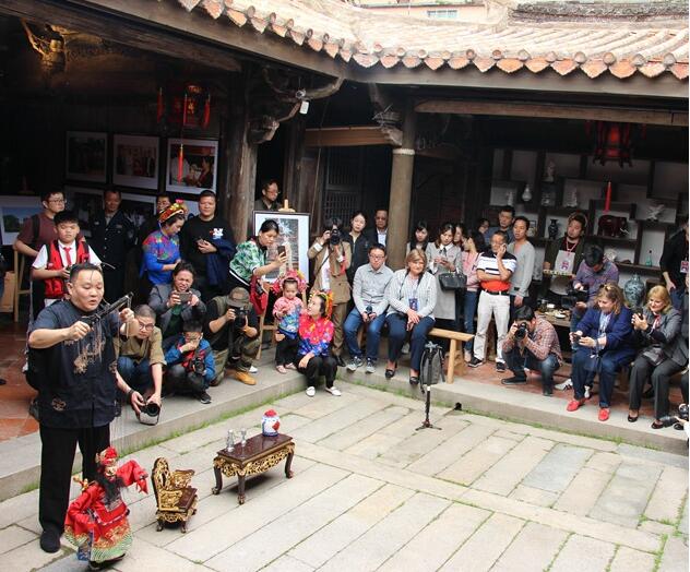後城古厝內,攝影愛好者在欣賞木偶戲表演《鍾馗醉酒》