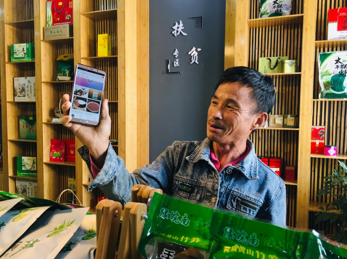 貧困戶胡毛娣在新華鄉今年新建立的O2O電商中心,開心地向筆者展示自己生產的土特產通過手機電商銷售。