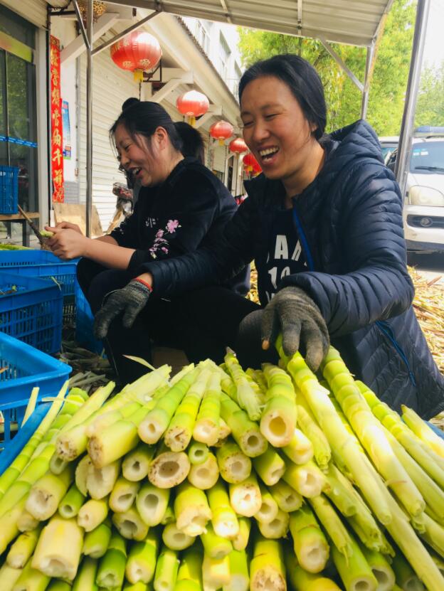 笋農在家剝笋,準備銷往當地的竹笋加工廠,露出幸福的笑容