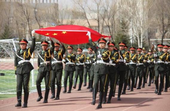 黑河學院的大學生國旗護衛隊邁着整齊而矯健的步伐護衛着五星紅旗走向升旗台(王洋 攝)