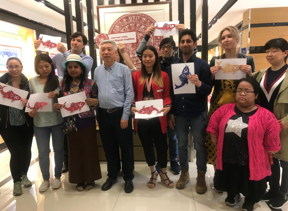 十位外籍友人與刻紙工藝大師楊兆群合影