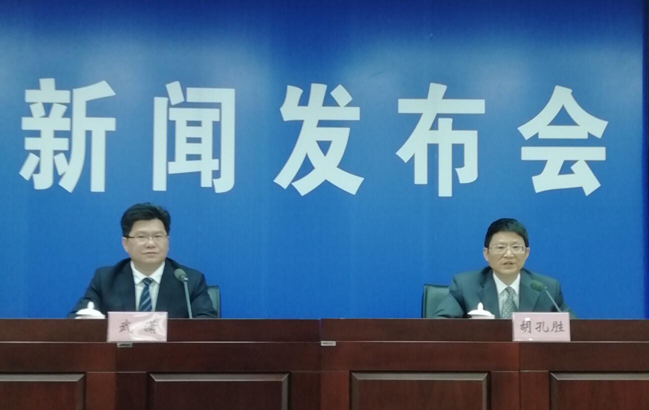 安徽省委宣傳部新聞發佈處處長武瀟(左)主持新聞發佈會,安徽省司法廳副廳長胡孔勝介紹安徽律師行業改革發展情況(孫軍/攝)