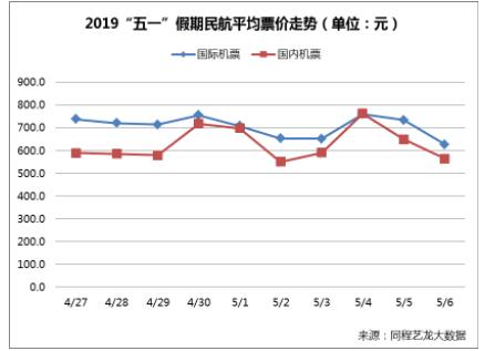 《報告》基於同程藝龍交通及機票大數據的分析顯示,“五一”假期期間民航和鐵路客流高峰主要集中在4月30日和5月4日,尤以5月4日的返程高峰客流量最為集中。4月29日開始,北京、上海、廣州、深圳、杭州、蘇州、西安、成都等城市鐵路、民航的出港客流將顯著上升,4月30日預計將形成節前出行客流高峰。返程客流高峰預計將出現在5月4日,這一天的機票票價水準也將是整個假期最高的。同程藝龍機票大數據顯示,“五一”假期期間的國內機票以5月4日的平均票價最高,達到了763元(不含稅費),甚至超過了同日國際機票的平均價格。4月30日的國內機票價格僅次於5月4日的返程客流高峰,平均票價為718元(不含稅費)。與國內航班相比,“五一”期間民航國際航班客流量波動相對較小,客流小高峰出現在4月30日和5月4日,平均票價最高為761元(不含稅費)。