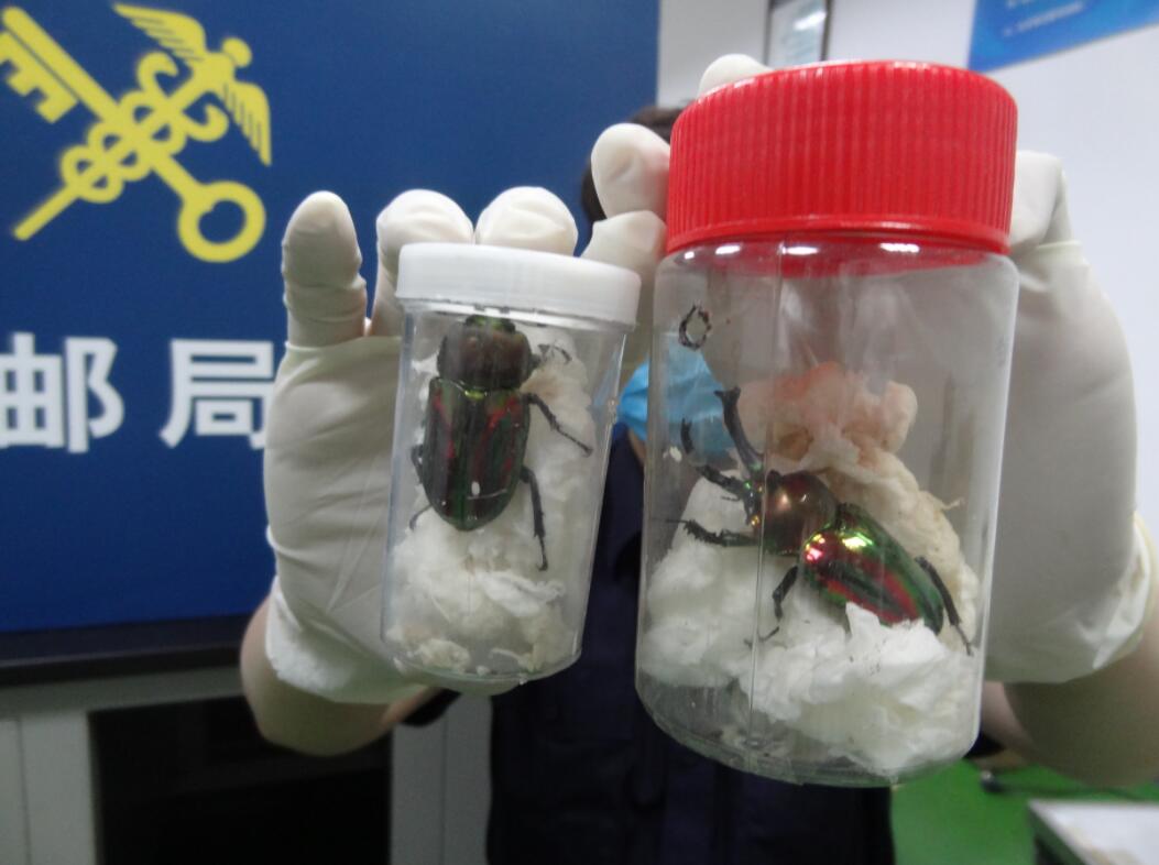 「經現場初步鑒別,這次查獲的2批甲蟲有3個不同品種,身長3-5厘米不等,顏色鮮艷漂亮。」廣州郵局海關郵遞物品監管科副科長李勇介紹說,「這些甲蟲都裝在塑料製成的容器內,容器內鋪墊着木屑或土壤,根據相關規定,活體昆蟲、土壤等均屬於禁止郵寄進境的物品,海關將依法進行處置。」