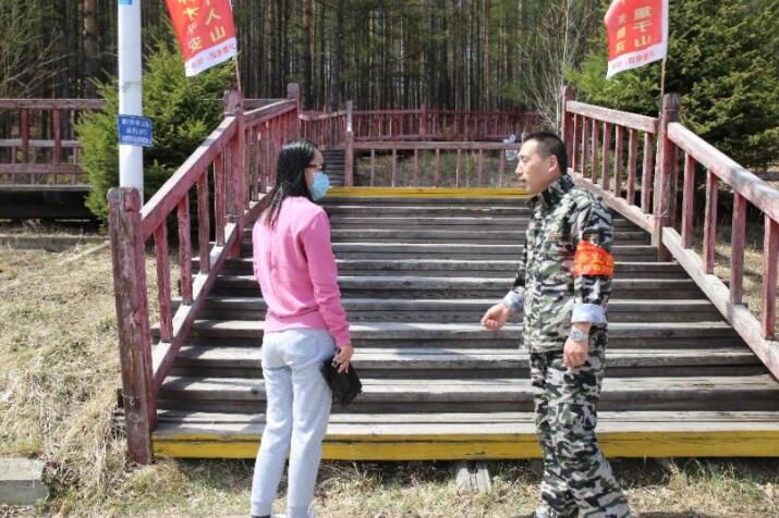 高嵩是新林區編辦的科員,也是今天的防火巡護員,在新林鎮原始森林公園附近,新林鎮的防火督查員正在讓他登記,高嵩在接受採訪時說:「在每年的防火高火險期,我們機關幹部都會在林緣重點地段進行巡護,作為林區的機關工作人員,我有義務向過往行人和入山遊客進行防火宣傳,讓更多的人知道進入林區防火第一。」