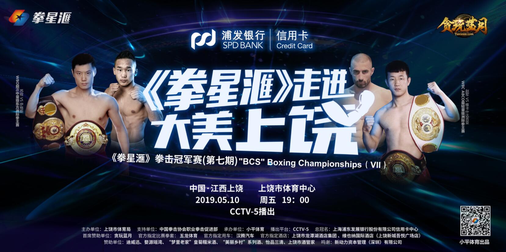 由浦發銀行信用卡中心獨家冠名的《拳星滙》·走進大美上饒2019年5月10日在上饒市體育中心舉行,本次比賽由上饒市體育局主辦,深圳市小平文化體育發展有限公司承辦,中國中央電視台體育頻道(CCTV5)播出。感謝以下單位對本次賽事的大力支持:浦發銀行信用卡中心、貪玩藍月、上饒市龍潭湖酒店集團 、五龍體育、漢騰汽車、上饒市天源龍湖酒店、維也納國際酒店(上饒新城吾悅廣場店)、迪威迅、婺源瑤灣、「夢裡老家」皇菊糯米酒、「美麗鄉村」系列酒、怡品三清、新動力資本管理(深圳)有限公司。