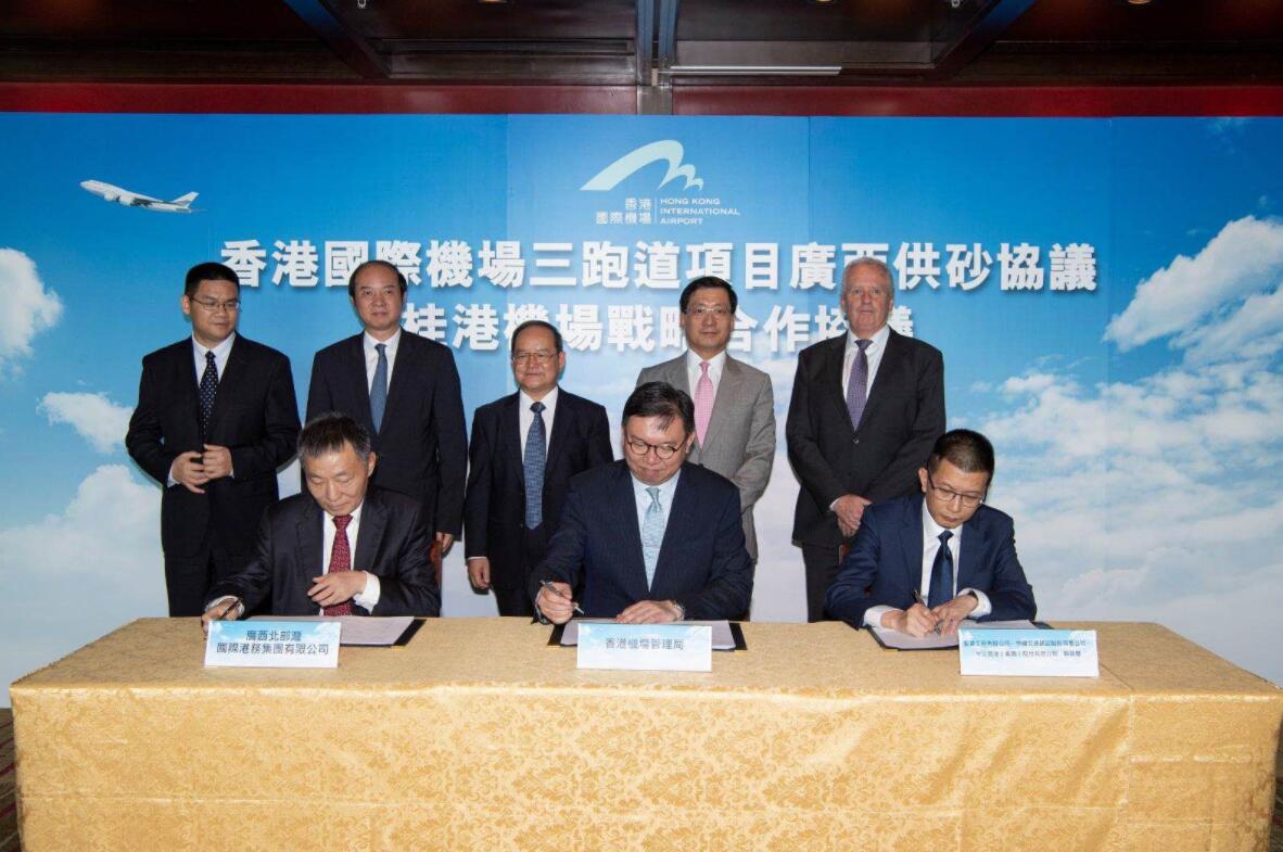 機管局、填海工程主要承建商振華工程有限公司一中國交通建設股份有限公司一中交疏浚(集團)股份有限公司聯營體、以及廣西北部灣國際港務集團有限公司的代表,在廣西壯族自治區黨委書記鹿心社及機管局行政總裁林天福的見證下,昨日於香港簽訂三方框架協議。根據協議,廣西的指定砂源將提供達到三跑道項目填海工程標準的海砂,並確保供應持續及穩定。