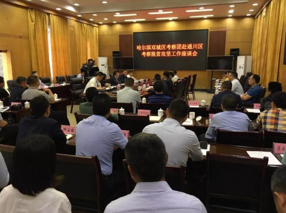 雙城區委書記李洪銘同志代表考察組一行對通川區委、區政府的熱情接待表示衷心感謝,並表明了學習考察的懇切態度,以及此次考察的學習重點,對通川區脫貧攻堅的政治站位、頂層設計、綜合施策、勇於創新以及取得的成效表示由衷讚賞。同時,希望通川和雙城在更廣泛的領域開展交流合作,並向通川區委、區政府各位領導發出誠摯邀請。會上,播放了《雙城區脫貧攻堅專題片》,區委副書記黃志同志介紹了雙城的歷史沿革、區位交通、資源稟賦、發展戰略、產業發展情況,以及雙城依託良好產業基礎,大力實施產業脫貧取得的效果,以及在脫貧攻堅過程中存在的主要問題,向與會的通川區同志進行了介紹。雙方就產業扶貧的利益鏈接機制,安全飲水維修管護長效機制,危房的置換和改造後產權歸屬,以及扶智扶志等方面進行了深入交流和探討。以杜海洋為首的通川同志,從創新理念把握原則,突破難點敢為人先,因地制宜多措並舉等方面提出了「通川方案」,並展示了通川區脫貧攻堅各類規範檔案,給學習考察組以深刻啟發。