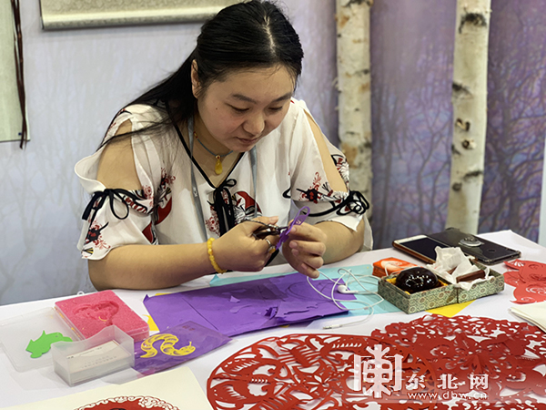 許敬雅在黑龍江展館內剪紙 許諾/攝