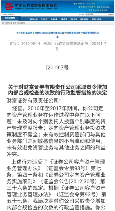 因此,根據《證券公司客戶資產管理業務管理辦法》(證監會令第93號)第五十七條,湖南證監局決定向財富證券采取責令增加內部合規檢查的次數的行政監管措施。