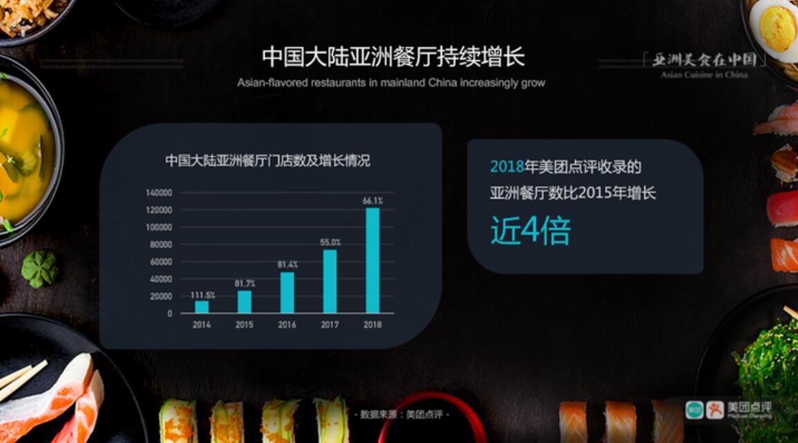 《數讀亞洲美食》報告數據顯示,中國大陸開設亞洲餐廳門店數保持持續增長態勢,年增長率均超50%。截至2018年底,美團點評共收錄中國大陸亞洲餐廳超過12萬家,比2015年增長了近4倍。