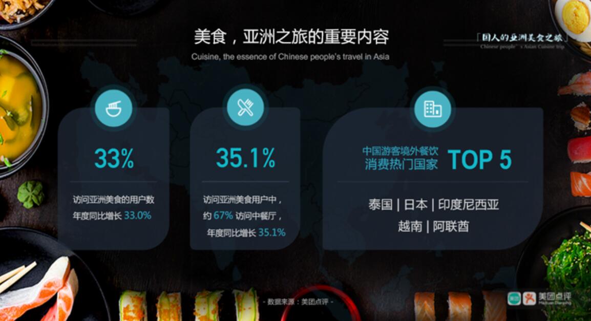 從美團點評數據來看,泰國、日本、印度尼西亞、越南、阿聯酋為亞洲餐飲消費熱門目的地,分列國人亞洲之旅餐飲消費前五。2018年,國人在旅途中訪問亞洲美食的用戶數比2017年增長33%。品嘗亞洲美食正在成為國人亞洲之旅的開心之選。