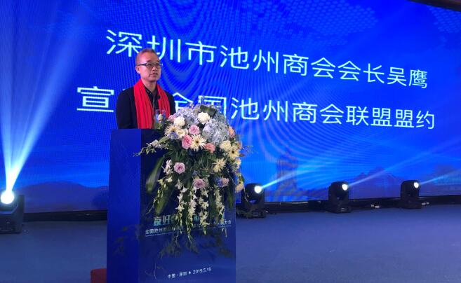 图三:深圳市池州商會會長吳鷹宣讀全國安徽池州商會聯盟盟約