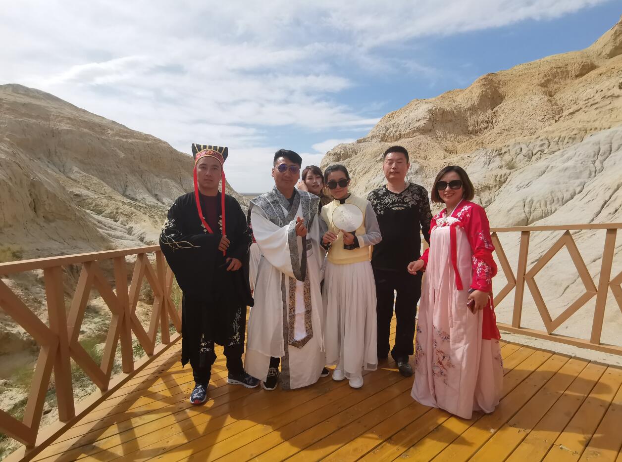 身着中華民旅服飾游自駕行遊客在觀賞全國獨一無二海上雅丹地貌烏倫古湖海上魔鬼城景區留影,(右二)中國露營聯盟會烏魯木齊分會副會長閆磊(右一)楊紅兵