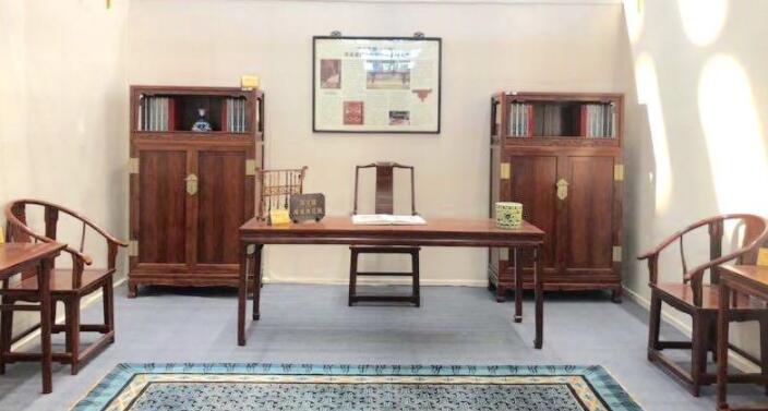 在9號館TC8展位伍氏興隆展廳裡邊,左右兩側布置了兩個書房體驗空間,陳設着黃花梨傢具和傳統文房用品。其中右側的書房內擺放的一整套傢具,即為本屆文博會獲得金獎的書房傢具。