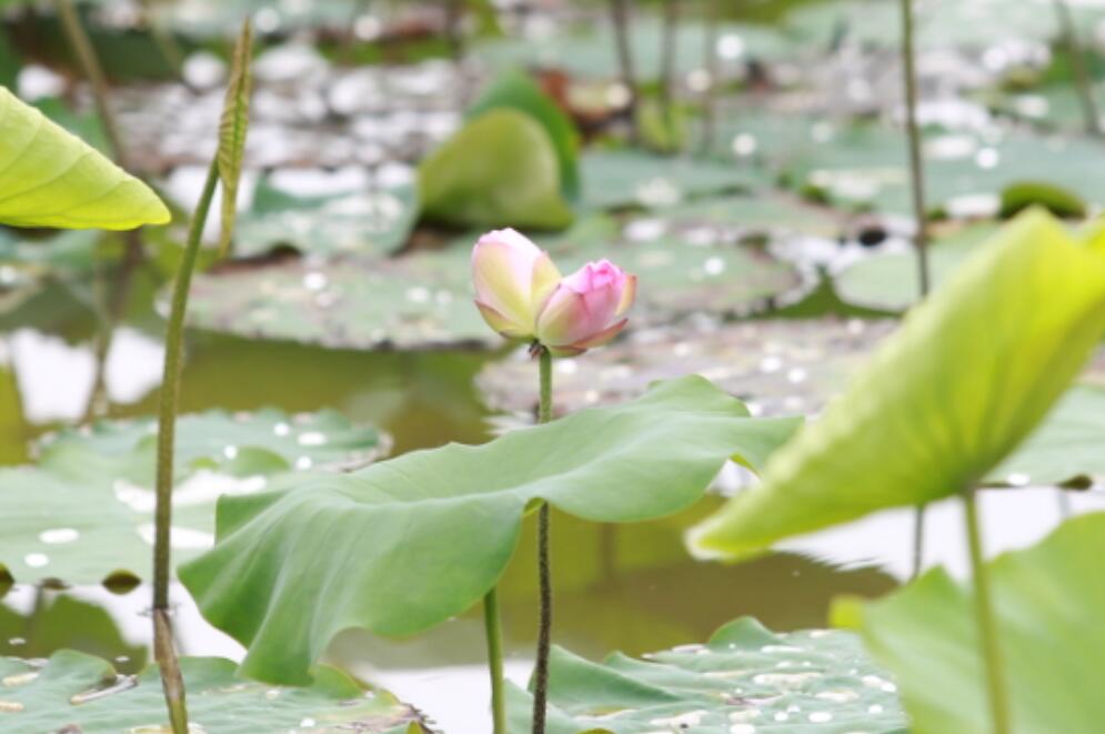 這株並蒂蓮在棧道附近,長得並不高,一株挺拔的荷莖上,兩朵荷花相依而靠,「頭靠着頭」,粉紅色的花瓣格外顯眼。目前還只是花蕾,含苞待放,「花中嬌子」的嬌羞形象已經展露無疑。據悉,並蒂蓮是花中珍品,其生成的幾率非常小,上千畝甚至上萬畝荷花中也難得一株,且不具有遺傳基因,難得一見,並蒂蓮素有寓意着美好兆頭。