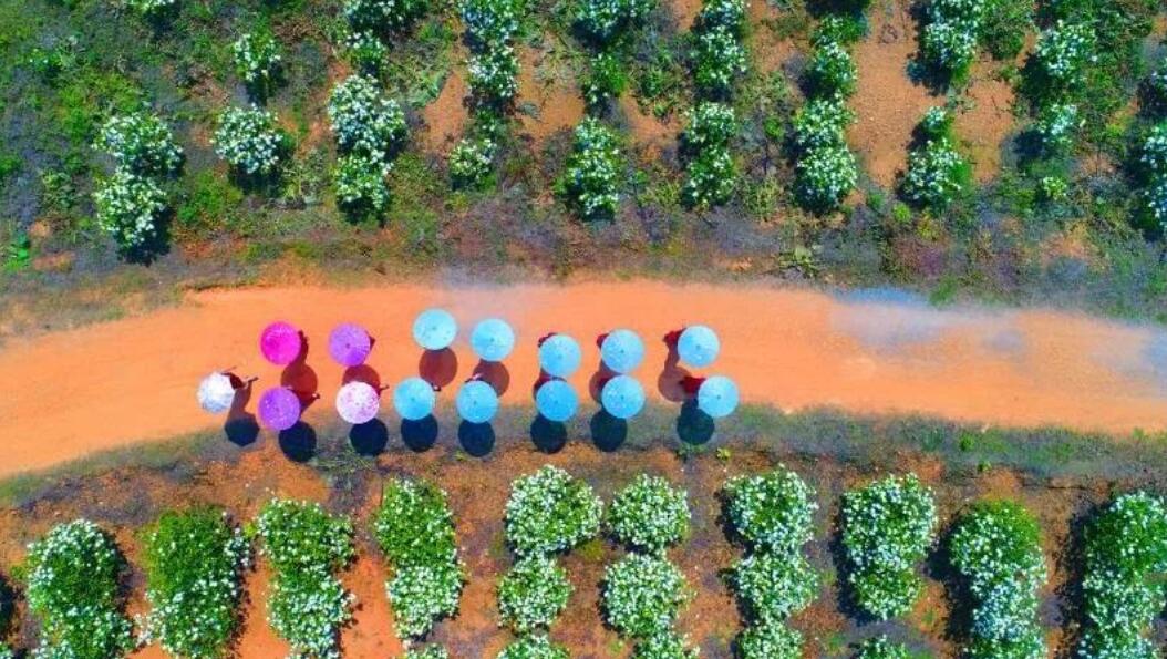 藍天白雲下,青山綠水間,連綿的山崗變成了花的海洋,漫山遍野的梔子花潔白如雪,芳香四溢,數千名遊客前來賞花拍照。