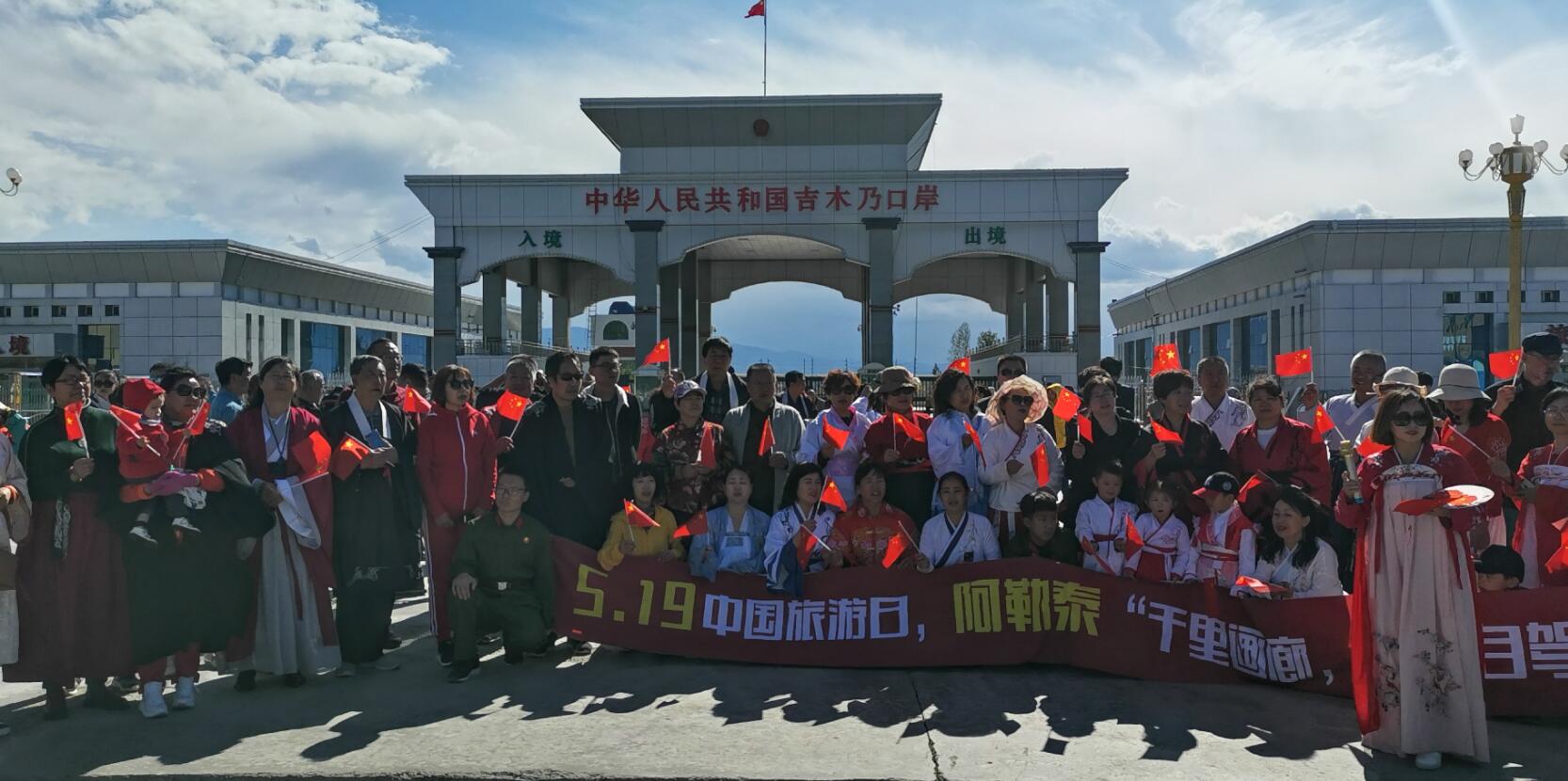 隨後在百年商埠吉木乃口岸。遊客着中華傳統服飾在新口岸前合影留念,聽導遊講述吉木乃口岸中哈貿易橋的67號界碑的故事。