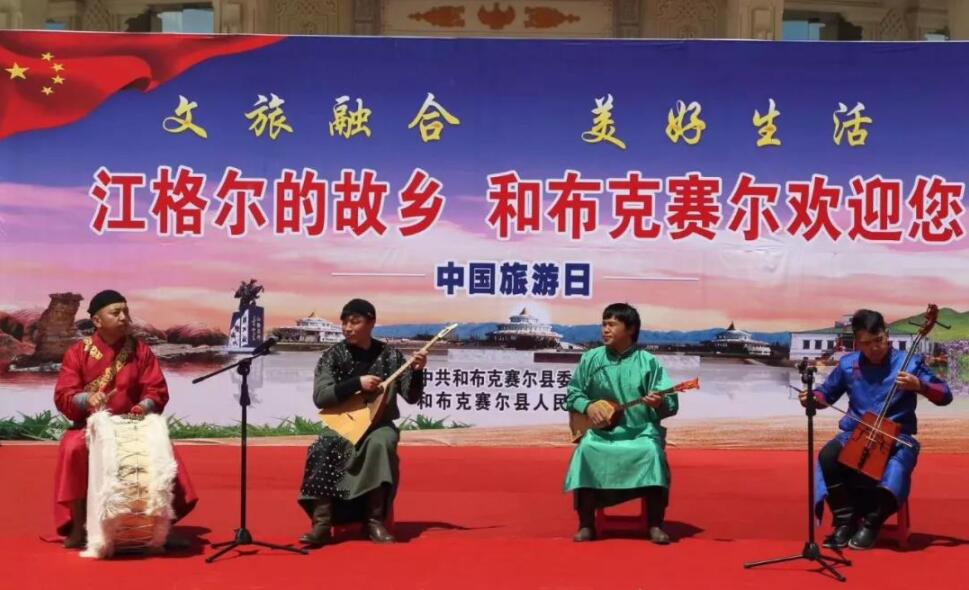 歡迎儀式上,和布克賽爾縣江格爾藝術團為遊客和媒體記者們表演了精彩的文藝節目,用獨具特色的江格爾說唱、精美的舞蹈,博得了在場觀眾的熱烈掌聲。