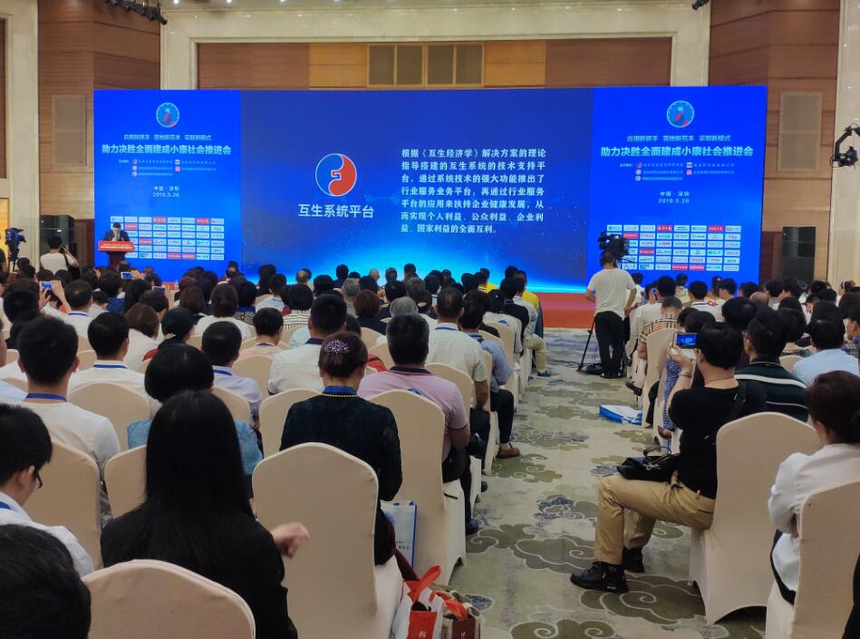 【香港商報網訊】記者 蘇偉 報導:為助力決勝全面建成小康社會,由北京互生經濟學研究院、互源碼科技有限公司、農創品牌運營股份有限公司、正道品牌運營股份有限公司、和睦社區網絡科技股份有限公司聯合主辦,各大商會、行業協會、聯盟組織、社團參與的「應用新抓手、落地新範本、採取新模式,助力決勝全面建成小康社會」推進會5月26日在深圳五洲賓館隆重舉行,來自全國各地各行業的人士500多人及30多家國內媒體參加了會議。會議旨在展示各地脫貧攻堅成果,提供精準扶貧經驗,介紹有效脫貧專案,推進減貧事業發展,並動員各商會協會、聯盟組織共同攜手,推進全面建成小康社會。