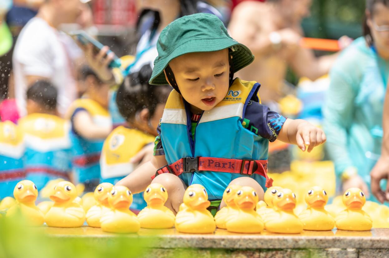 作為陪伴大小「玩水家」一同成長的小夥伴,橡皮小黃鴨成為童真的快樂和幸福的象徵。今年6月,長隆水上樂園攜手LT Duck,推出「長隆水上小黃鴨兒童嘉年華」主題活動,設立三大小黃鴨的主題體驗區:第一個體驗區位於「奇妙親子水城」,孩子們在溫水按摩池內將會邂逅超過一萬隻小黃鴨。在按摩池前,長隆水上樂園還頗具匠心地打造了一座小黃鴨拱門,與「奇妙親子水城」的動物主題拱門遙相輝映,搭配上多個不同造型的小黃鴨主題公仔,活動當天成為親子玩水家庭的熱門打卡點,定格樂享天倫的溫馨瞬間。