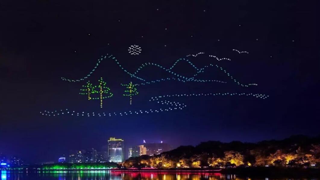 在現場,600架無人機在美麗的八裡湖緩緩升空,在絢爛的城市光影背景下變換成廬山的剪影,從這座山開始,講述一個關於茶的故事。接着,廬山的剪影變換成茶幼苗,幼苗逐漸成長出粗壯的樹幹和茂密的樹葉,經歷了風吹雨打,依然茁壯成長。採茶的季節又到了,此時夜空中出現了一個背着茶框的小姑娘,正在採摘著新茶。隨後,空中慢慢浮現出茶壺,從壺中倒出「茶」字。最後,「茶泉雙秀 大美九江」,作為結束語,寓意2019九江國際名茶名泉博覽會完滿成功,九江歡迎天下客。