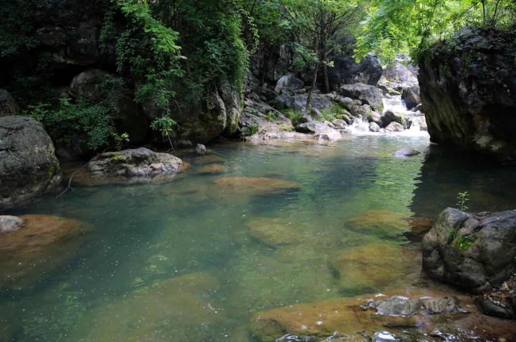 折返,車行幾分鐘就到了兵馬峽,人還沒靠近,只感覺一陣涼風從峽穀裏迎面吹來,頓感涼風習習,清爽宜人。兩邊高聳的崖壁,崖縫裏不時有紫藤、櫨木、崖柏、紫薇、黃楊等頑強的生長著。