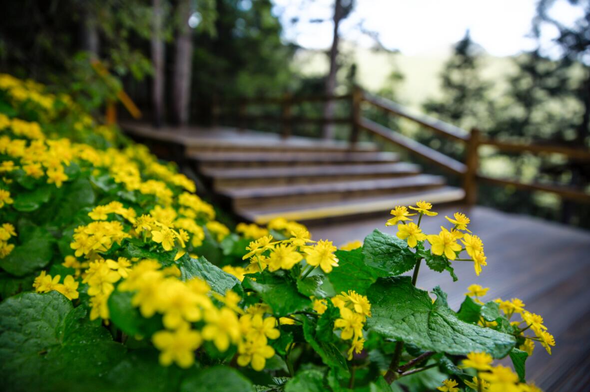 初夏的黃龍,雨水豐沛、草木繁茂,一派生機。雨後的森林濕潤度達90%,讓皮膚吸飽了水。細雨中,霧氣升騰,宛若仙境。穿行在黃龍景區里,有趣的小植物和植物科普知識可沿途獲知,灌叢下、彩池邊、棧道旁都能近距離欣賞到西藏杓蘭、黃花杓蘭、紫點杓蘭等不同品種、不同色彩的黃龍高山野生蘭花家族。