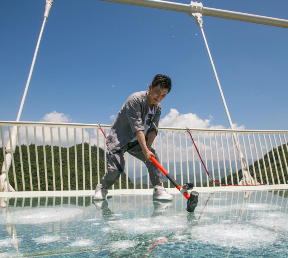 玻璃桥安全测试,湖南卫视主持人李锐抡锤亲测玻璃桥