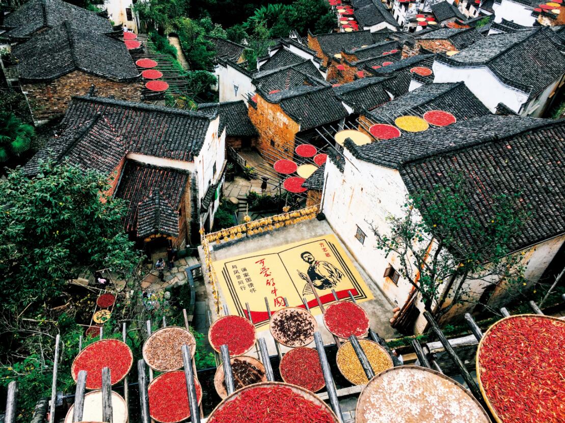 篁嶺曬秋是大幅張力四射、五彩繽紛的豐收圖畫,是喜悅,是富庶,是嫵媚,是熱辣。每年秋天,山居的房前屋後成了竹嗮匾的世界,五顏六色的作物與粉牆黛瓦、青山綠水的民居相得益彰,儼然一幅惟妙惟肖的大地藝術精品。