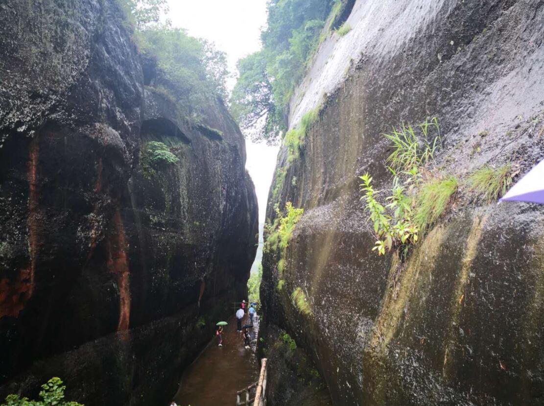 丹霞山世界地質公園總面積292平方公里,核心景區168公里,由680多座頂平、身陡、麓緩的紅色砂礫岩石構成,以赤壁丹崖為特色。石峰疏密相間、錯落有序,山石不論大小,座座雄風大氣,盡顯陽剛之氣。據說7000萬年前,地球還處於白堊紀時期,這裡是一片大湖泊,受喜馬拉雅造山運動的影響,地殼上升,湖底地形被抬升為陸地,炎熱的氣候使富含鐵質的沉積物強烈氧化,形成紫紅褐色岩石。在隆起抬升的過程中,岩層間形成了許多縱橫交錯的斷層和節理,紅色的砂岩和礫岩層在斷裂的切割以及雨水、河水的長期侵蝕綜合作用下,經自然崩塌後形成了懸崖峭壁,即我們現在所見的垂直山體。位於長老峰南緣的福音峽,它就是流水沿垂直地表的斷層裂隙向下侵蝕形成的深切峽谷,峽谷兩側為垂直豎立的崖壁,谷底平直,狹長幽深,地貌學上稱其為巷谷。峽谷長約120m,同一個岩層界面在峽谷南北兩側的高差為數十厘米,北低南高,受山體的形態影響,峽谷的截面呈沙漏狀,上邊最寬、中間最窄(最窄處僅約2m),谷底略寬。