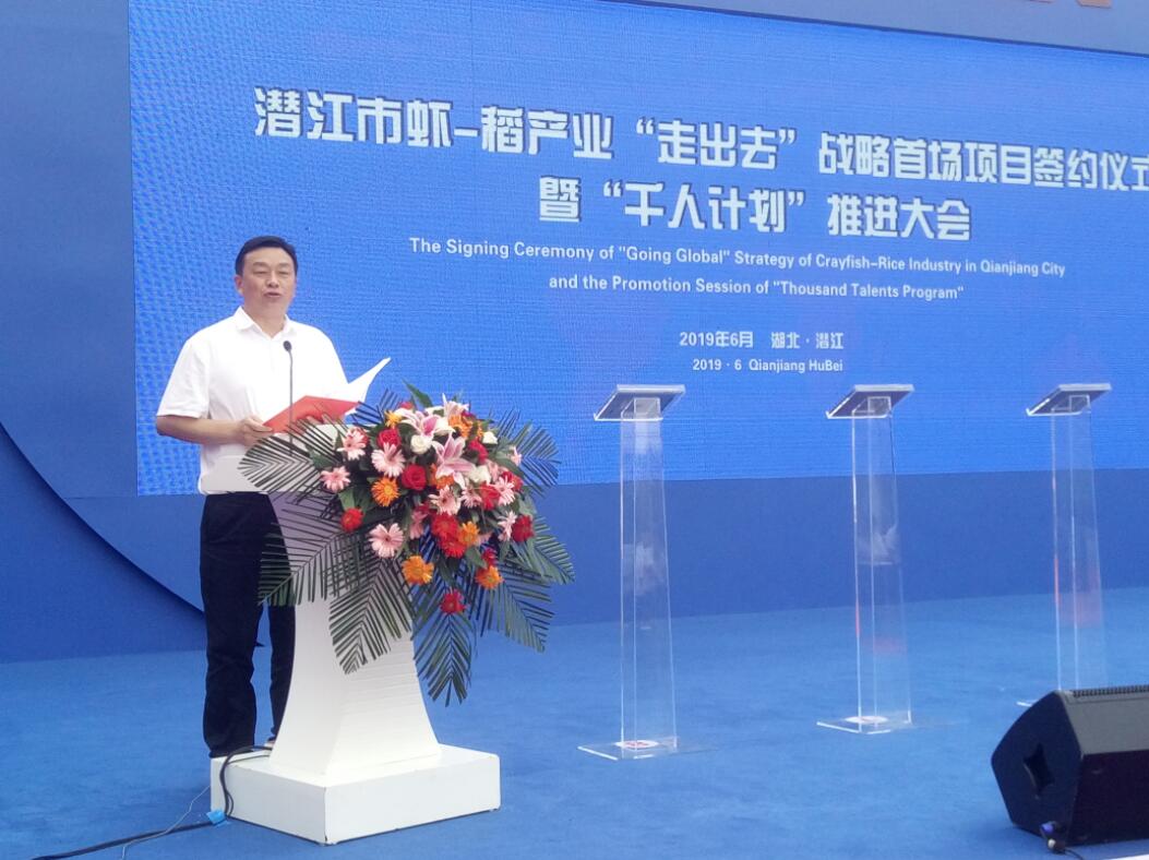 「我市蝦-稻產業目前已形成了集科研示範、選育繁育、生態種養、精深加工、餐飲物流、品牌文化等於一體的完備產業鏈條,在全國開設餐飲直營和加盟店2500餘家,與全國13個地區和45家企業實現品牌共用,潛江市也成為了『中國小龍蝦之鄉‘』中國蝦-稻之鄉『和』中國小龍蝦加工出口第一市『」吳祖雲在致辭中介紹道。他說,目前潛江市蝦-稻產業進入了向特色化、高端化、品牌化跨越轉型的關鍵階段,「走出去」戰略的提出「正逢其勢」「正逢其時」「正逢其需」。