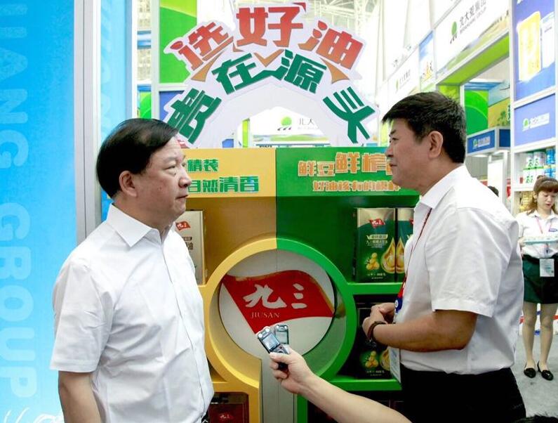 【香港商報網訊】6月17日上午,黑龍江北大荒農墾集團總公司黨委書記、局長、董事長王守聰到九三集團展位調研、指導北大荒綠色智慧大廚房主要產品和創新產品的參展情況。九三集團總裁史永革介紹了「九三精榨食用油」「北大荒有機豆腐」「九三時尚精品核桃油」等最新產品。