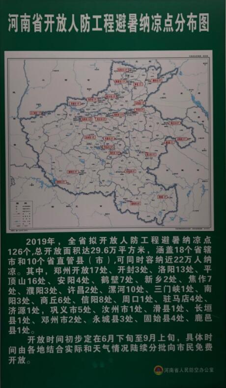 今年的人防工程避暑納涼工作按照河南省人防辦統一部署,準備工作已全部到位,全省18個省轄市、10個省直管縣(市)全部參與人防工程避暑納涼工作,擬開放人防工程避暑納涼點126個,總開放面積達29.6萬平方米,可同時容納近22萬人納涼。其中,鄭州開放17處、開封3處、洛陽13處、平頂山16處、安陽4處、鶴壁7處、新鄉2處、焦作7處、濮陽3處、許昌2處、漯河10處、三門峽1處、南陽3處、商丘6處、信陽8處、周口1處、駐馬店4處、濟源1處。開放時間初步定在6月下旬至9月上旬。