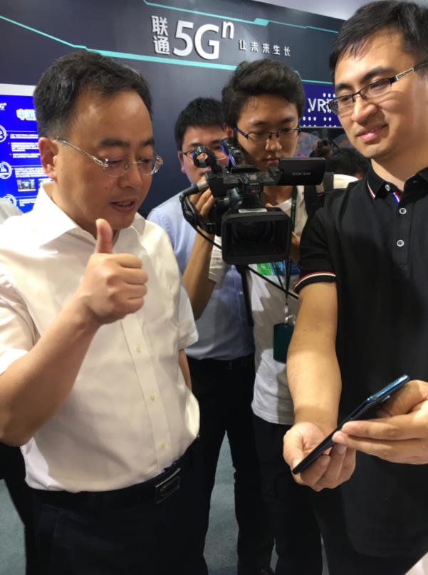 峰會現場,南京江寧區人民政府區長嚴應駿與位於深圳總部的華為企業BG副總裁、全球銷售部總裁馬悅通過華為Mate20X5G手機和聯通5G網絡進行5G高清視頻通話。