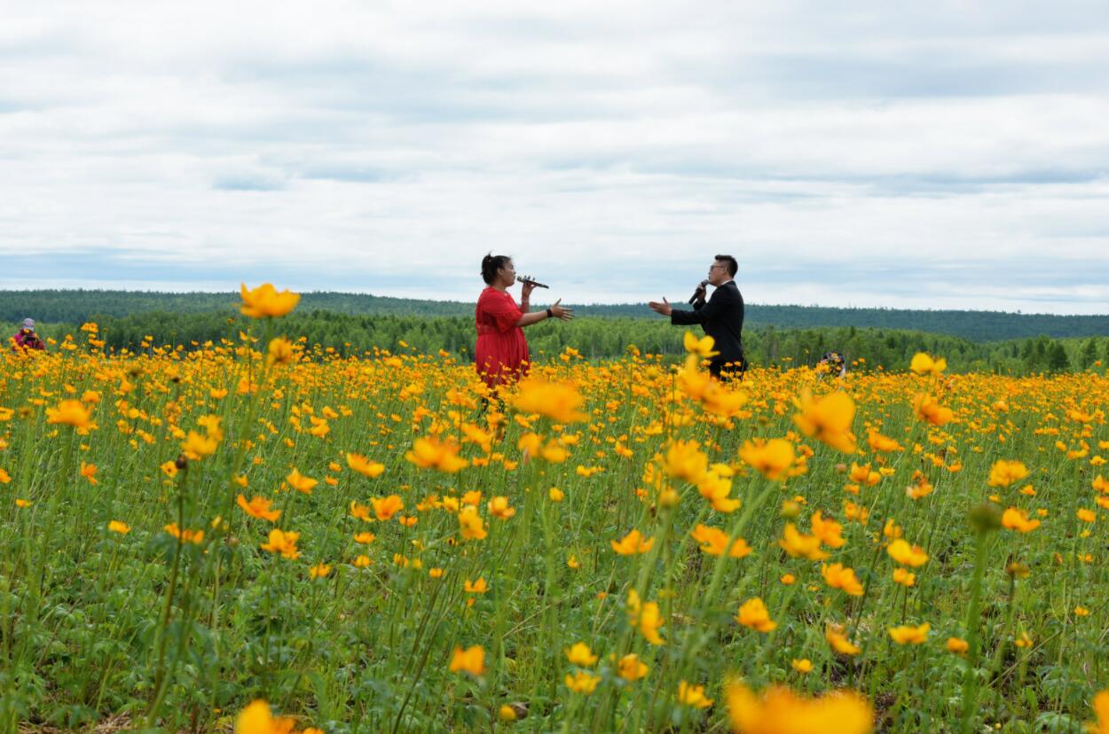 金蓮花基地內,那一簇簇、一朵朵金黃色的金蓮花在微風中搖曳,那亭亭玉立的身影更顯婀娜多姿,花兒在陽光的沐浴下,更顯嬌艷無比,在這美麗的景色中,俊男靚女們表演的《花開的時候你就來看我》《康定情歌》《只要有你》《美麗的神話》等情歌對唱,更是讓來八方賓高興萬分,特別是專程趕來參加首屆中國呼瑪「金蓮花」杯全國風光攝影大賽第二次採風活動的各路攝影家和攝影愛好者們,更是激動不已,湛藍的天空,如絮的白雲,清新的空氣,飄香的田野,讓他們情不自禁地拿起手中的相機拍個不停。