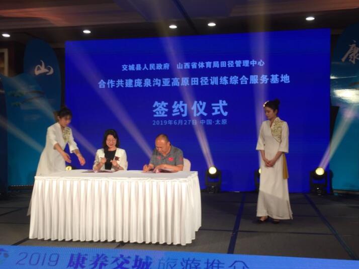 發佈會上,交城縣人民政府與山西省體育局田徑管理中心就合作共建龐泉溝亞高原田徑訓練綜合服務基地、山西省中長跑訓練基地、果老峰戶外休閒運動小鎮、龐泉溝“馬拉松”比賽基地、山地自行車賽事基地、交城縣高原戶外活動體能測試中心等基地簽署了合作意向。郵政集團公司山西分公司分別為交城文創基地和特許生產商進行了授牌。交城縣如金園藝發展有限公司與廣州綠光景觀設計有限公司就如金溫泉二期康養項目進行了簽約。
