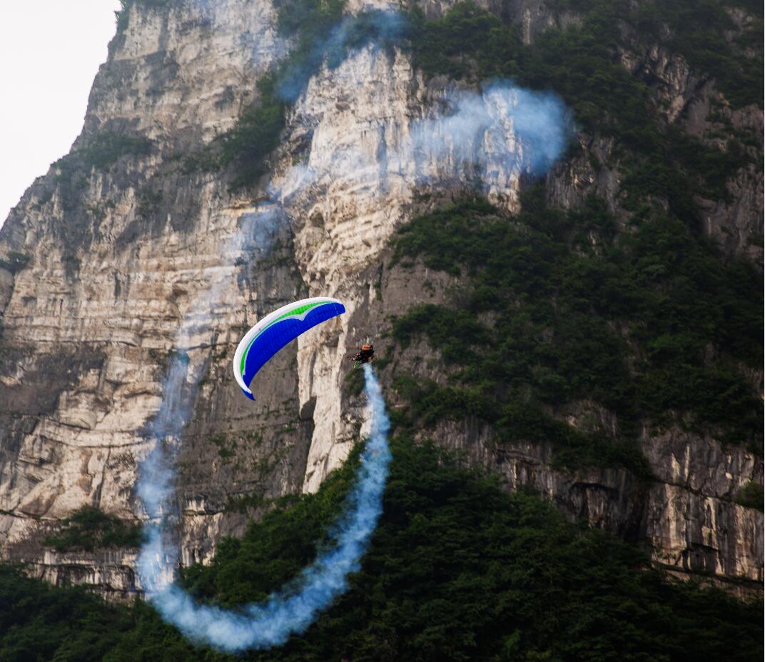 2019“極限飛蕩”動力傘特技國際大師賽是首次在張家界市舉辦的世界最高技術水準的國際動力傘特技表演活動,包括繞標競速賽、花式技巧賽、編隊飛行表演以及創意組合表演。(張思靜 丁雲娟)