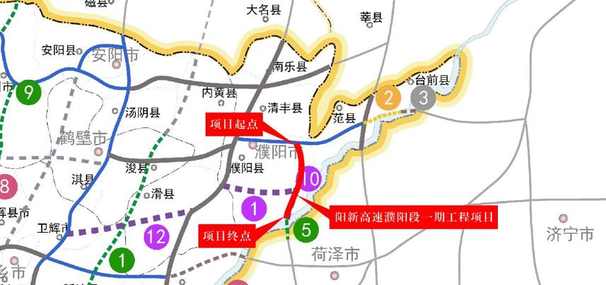 據了解,2個高速公路項目主線均按照設計時速100公里的雙向四車道標準建設。其中,陽新高速濮陽段項目路線全長33.916公里,項目位於濮陽市境內,整體呈南北走向,北接濮范高速,在濮陽縣梨園鄉到達項目終點,與規劃的黃河特大橋北橋頭相接。