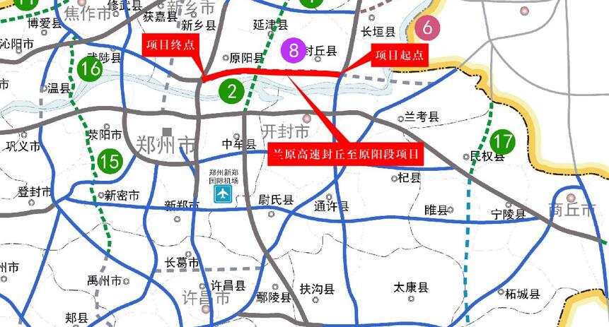 蘭原高速封丘至原陽段項目路線全長約67.467公里,項目位於新鄉市境內,整體呈西東走向。起於封丘縣東接大廣高速公路(G45),止於京港澳高速與原焦高速交叉樞紐互通式立交處。