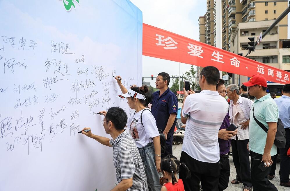 6月26日,以「健康人生 綠色無毒」為主題的2019年撫州市「6·26」國際禁毒日暨黨員進社區宣傳活動在臨川大道城西社區舉行。禁毒知識展板進社區、進學校、進廠礦進行廣泛宣傳,時刻提醒大家要珍愛生命,遠離毒品,呼籲全市人民參與禁毒,拒絕吸毒。現場,社區黨員、志願者、市民踴躍參加簽名活動。(黃穎)