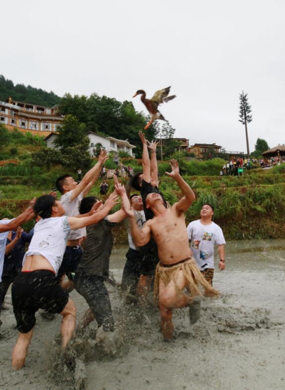 6月29日,在湖南張家界市武陵源區中湖鄉五號山谷度假民宿舉辦的第四屆鄉村民宿旅遊和農耕文化節中,遊客和當地村民一道在稻田的泥水間拔河、搶鴨、賽跑、摸魚、插秧,體驗鄉村民宿旅遊樂趣,感受田園生活。(張思靜 吳勇兵)