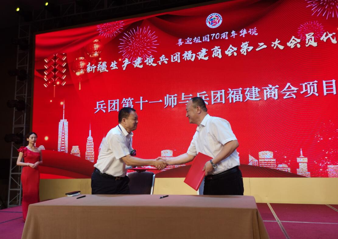 會上,商會還與兵團第十師、十一師簽訂了戰略合作伙協議,同時商會還現場向兵團第十師北屯市貧困邊境團場捐款20萬,商會的成功換屆標誌着兵團福建商會又揭開嶄新的一頁。