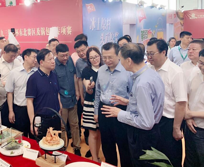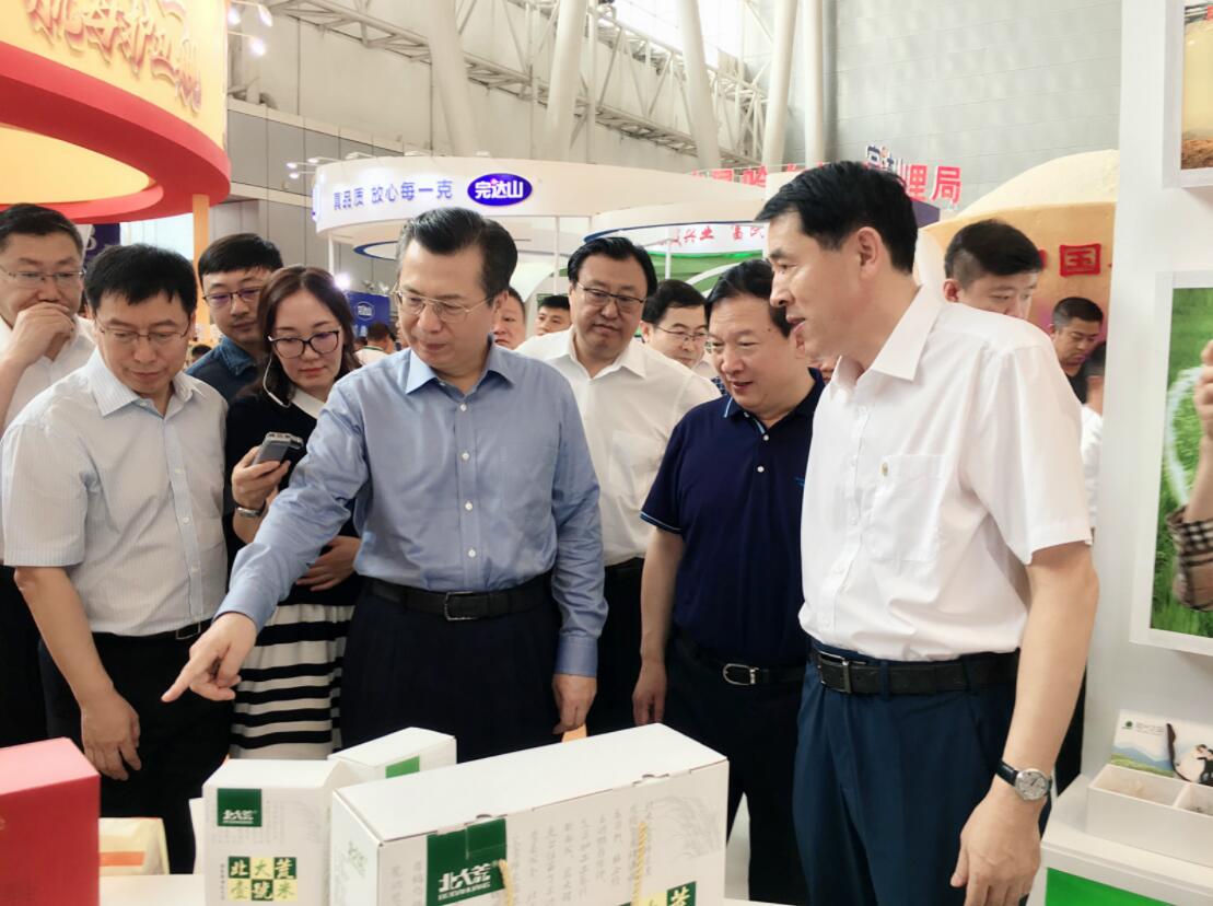 在黑龍江建三江經濟開發區展區內,標有「中國糧食 中國飯碗」2米多高的青花瓷飯碗格外醒目,展台上建三江盛產的各種大米「托舉」起這個青花瓷碗。王永康等繞青花瓷碗一周,不時與參展企業交流食品安全並頻頻點頭,關注國家糧食安全。