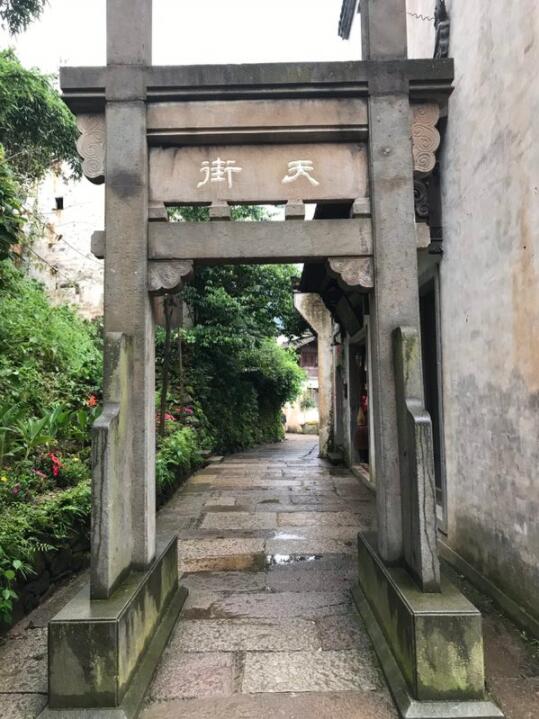 穿過林蔭大道我們來到天街。天街是篁嶺唯一一條平坦的街道,一色大塊石板地面,聯接着「三橋六井(塘)九巷」,把聚居在峭壁上的一百多戶人家有機地組合到一起。天街長五百餘米,繞山伸展,形成了幾個相對獨立且各具特色的街區。漫步前行,滿眼都是徽式商鋪和層層疊疊的傍山房屋,我和同行的作家們如同進入一個遙遠而又斑斕的年代。