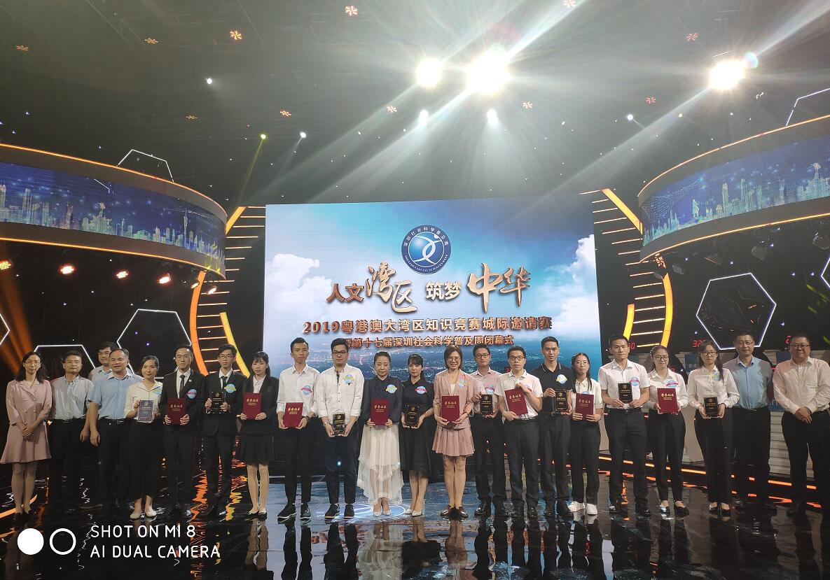 【香港商報網訊】記者 蘇偉 報導:7月8日下午,由深圳市委宣傳部、深圳市社會科學聯合會、深圳廣電集團聯合主辦的「人文灣區 築夢中華」2019粵港澳大灣區知識競賽城際邀請賽暨第十七屆深圳社會科學普及周(2019)閉幕式,在深圳廣電集團800平米演播廳隆重舉行。深圳市委宣傳部常務副部長陳金海、深圳市社科院(聯)黨組書記、院長吳定海、深圳市社科院(聯)黨組成員、副院長王為理、深圳廣播電影電視集團副總經理鄭鼎文等領導出席了當天的活動。深圳廣電集團新聞中心主持人韓松、深圳廣電集團移動電視頻道主持人明怡搭檔主持本場比賽。經過逾兩個多小時過五關斬六將的激烈比賽,來自廣州代表隊的廣州喜羊羊隊獲得冠軍,而來自深圳代表隊的鵬程萬里隊惜敗獲亞軍!,季軍由香港代表隊的香港耀東方隊獲得。