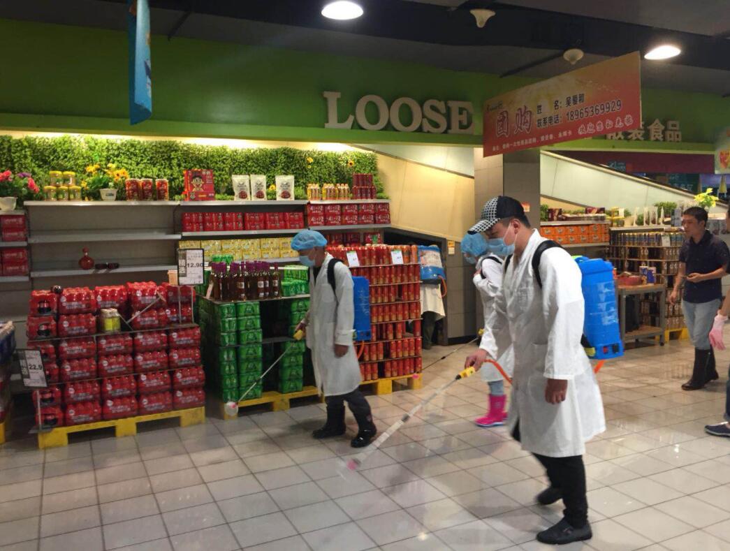 7日,縣科盛有害生物防治有限公司員工在永輝超市(松溪店)開展災後環境應急消殺工作