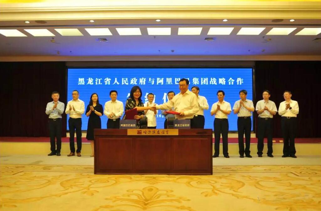 【香港商報網訊】7月16日晚上,在黑龍江省哈爾濱市友誼宮舉行的黑龍江省人民政府與阿里巴巴集團戰略合作簽約儀式上,北大荒農墾集團總公司與阿里巴巴(中國)軟件有限公司簽訂戰略合作協議。